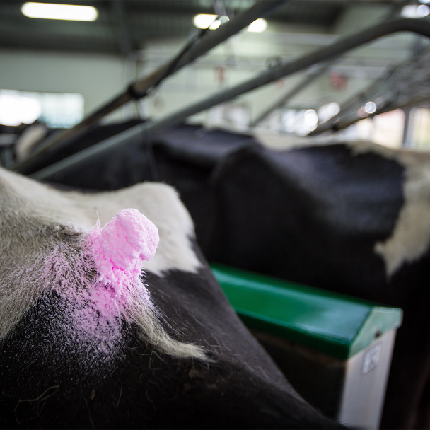 Foam Mark is a temporary fluorescent pink foaming marker used to identify cows to be drafted out.